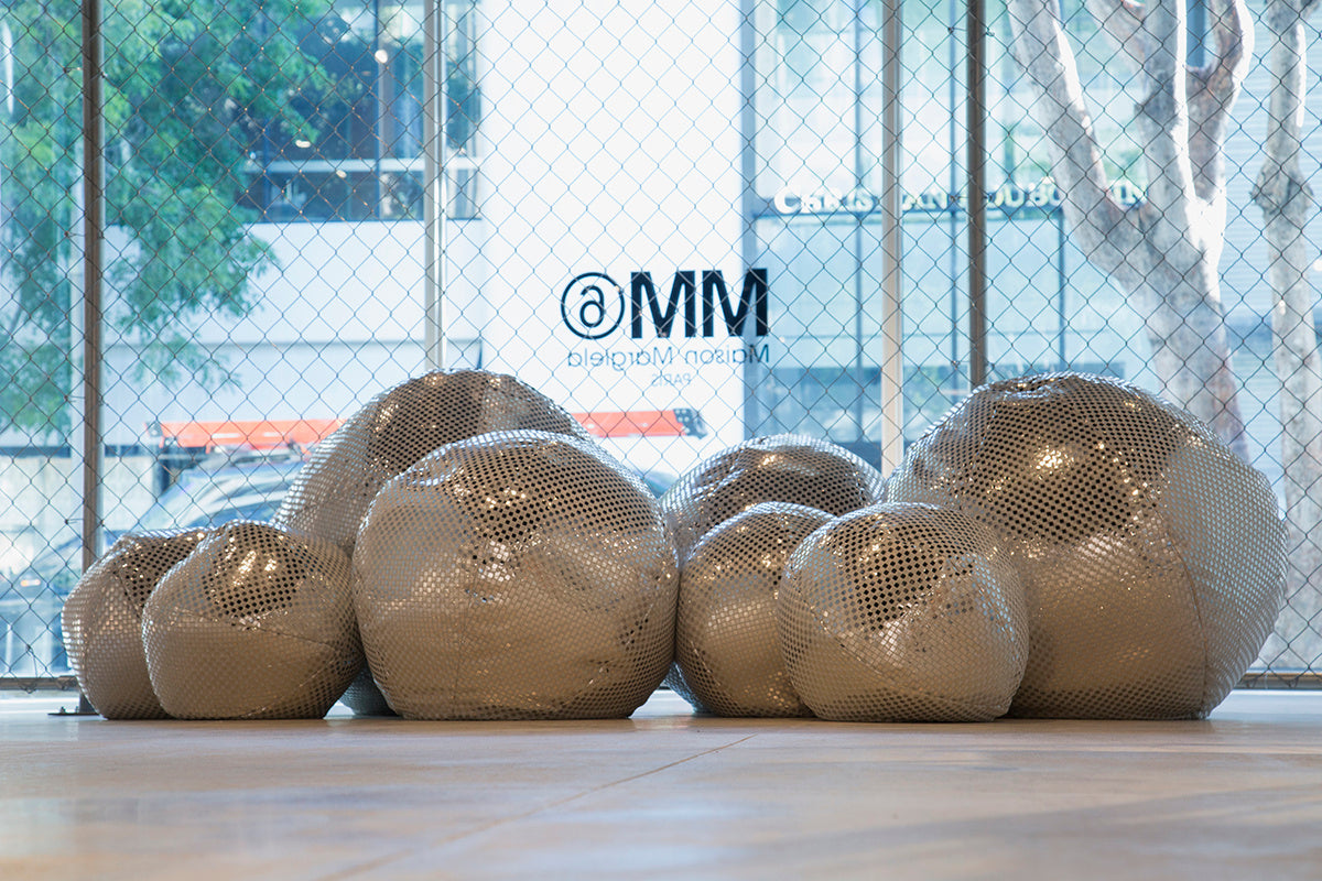 Unveiling its first ever USA pop up, the experimental women's line of Maison Margiela-MM6 is invading Miami's Design District. The pop up is covered in silver and chrome accents and shelving with raw concrete spaces and baroque inspired wallpaper, fit for the contemporary vibe, especially the giant plush disco balls.